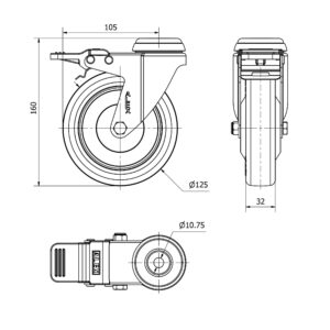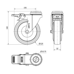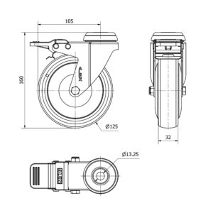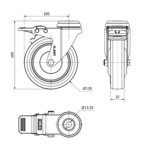 Rueda poliuretano giratoria con freno Alex diametro 125 mm. modelo 2-2472