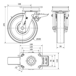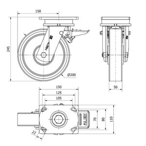 Rueda poliuretano giratoria con freno Alex diametro 200 mm. modelo 2-3944