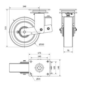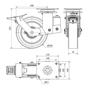 Rueda poliuretano giratoria con freno Alex diametro 250 mm. modelo 2-3947