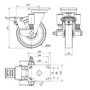 Rueda poliuretano giratoria con freno Alex diametro 200 mm. modelo 2-3668