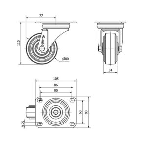 Rueda goma giratoria Alex diametro 80 mm. modelo 2-3497