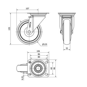 Rueda goma giratoria Alex diametro 125 mm. modelo 2-0860