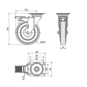 Rueda goma giratoria con freno Alex diametro 150 mm. modelo 2-3580