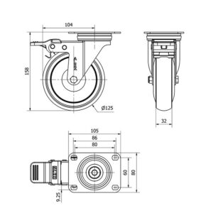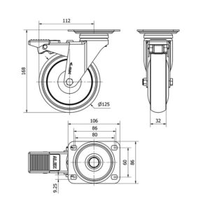 Rueda goma giratoria con freno Alex diametro 125 mm. modelo 2-1680