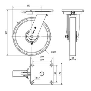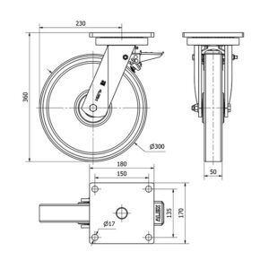Rueda poliuretano giratoria con freno Alex diametro 300 mm. modelo 2-1538
