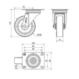 Rueda poliuretano giratoria Alex diametro 100 mm. modelo 2-2435