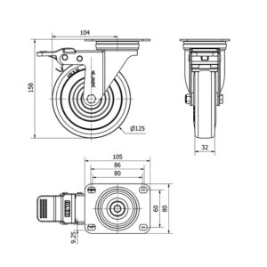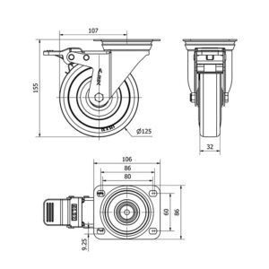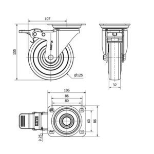 Rueda goma giratoria con freno Alex diametro 125 mm. modelo 2-2413