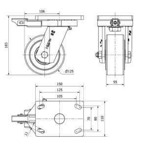 Rueda nylon-poliamida giratoria con freno Alex diametro 125 mm. modelo 2-4423