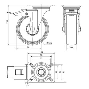Rueda poliamix giratoria con freno Alex diametro 125 mm. modelo TW0208
