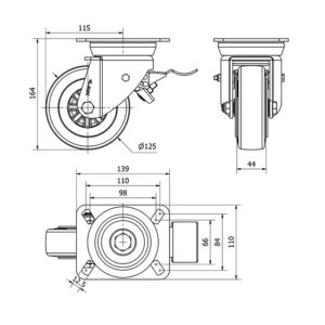 Rueda goma giratoria con freno Alex diametro 125 mm. modelo 2-2752