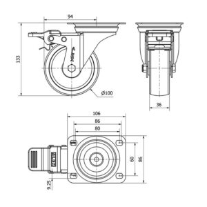 Rueda poliamix giratoria con freno Alex diametro 100 mm. modelo 2-2343