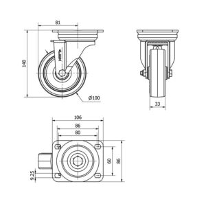 Rueda poliuretano giratoria Alex diametro 100 mm. modelo 2-2526