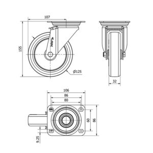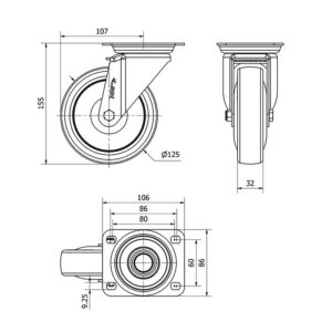 Rueda poliuretano giratoria Alex diametro 125 mm. modelo 2-2375