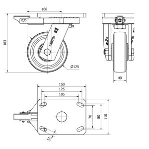 Rueda goma giratoria con freno Alex diametro 125 mm. modelo 2-2048