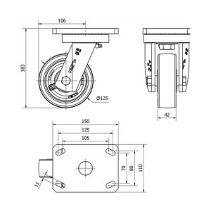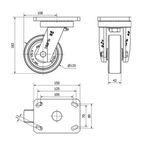 Rueda poliuretano giratoria Alex diametro 125 mm. modelo 2-0483