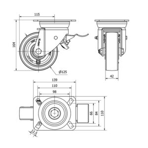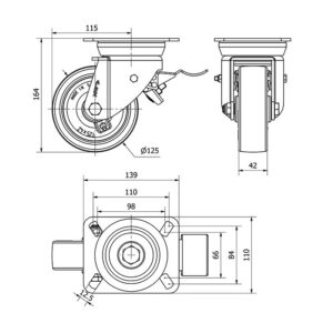 Rueda poliuretano giratoria con freno Alex diametro 125 mm. modelo 4-1211
