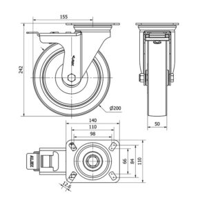 Rueda poliuretano giratoria con freno Alex diametro 200 mm. modelo TW0313