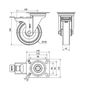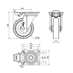 Rueda poliuretano giratoria con freno Alex diametro 150 mm. modelo 2-2018