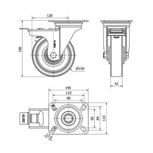Rueda poliuretano giratoria con freno Alex diametro 150 mm. modelo 2-2019