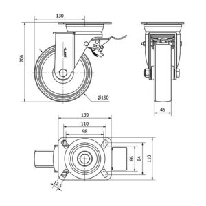 Rueda nylon-poliamida giratoria con freno Alex diametro 150 mm. modelo 2-1635