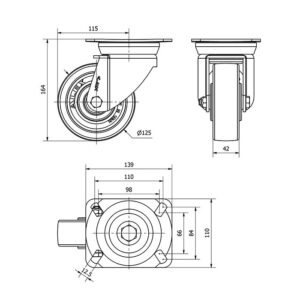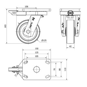 Rueda nylon-poliamida giratoria con freno Alex diametro 125 mm. modelo 2-1823