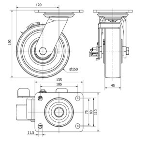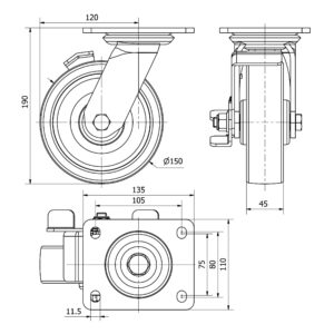 Rueda nylon-poliamida giratoria con freno Alex diametro 150 mm. modelo 4-1619