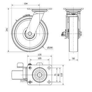 Rueda nylon-poliamida giratoria con freno Alex diametro 200 mm. modelo 2-2699