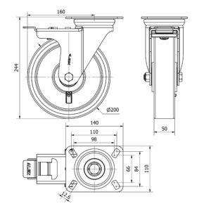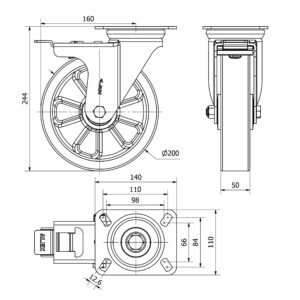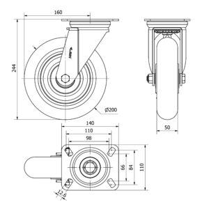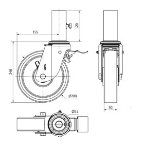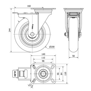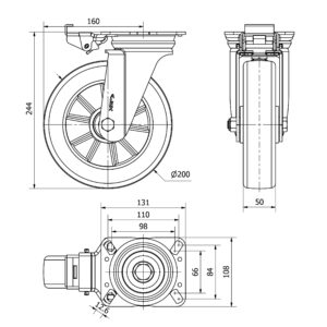 Rueda poliuretano giratoria con freno Alex diametro 200 mm. modelo 2-3953