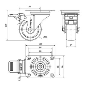 Rueda poliamix giratoria con freno Alex diametro 80 mm. modelo TW0206