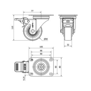 Rueda poliuretano giratoria con freno Alex diametro 80 mm. 2-0332
