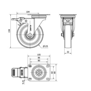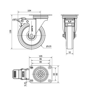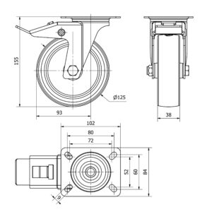 Rueda poliuretano giratoria con freno Alex diametro 125 mm. modelo TW0219