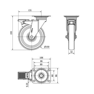 Rueda poliuretano giratoria con freno Alex diametro 150 mm. modelo 2-1529