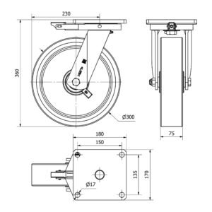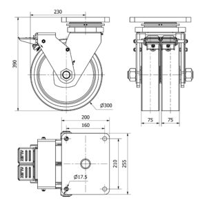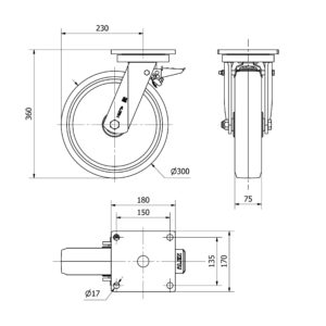 Rueda poliuretano giratoria con freno Alex diametro 300 mm. modelo 2-3743