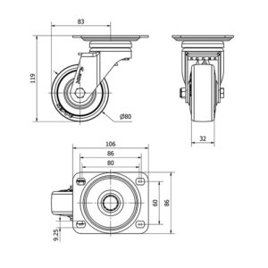 Rueda goma giratoria Alex diametro 80 mm. modelo 2-3206