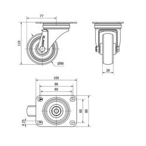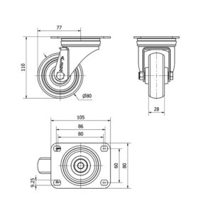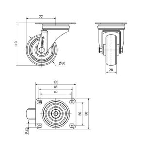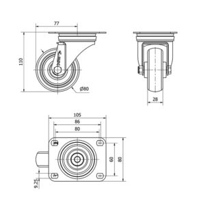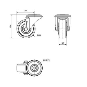 Rueda goma giratoria Alex diametro 80 mm. modelo 2-3210