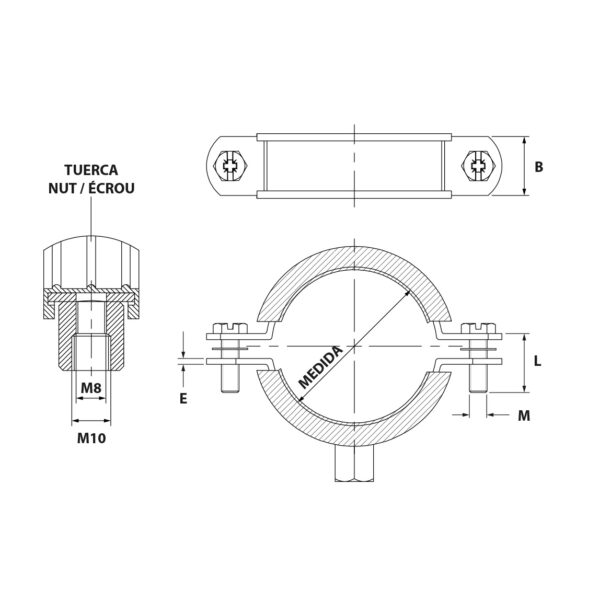 Abrazadera isofonica reforzada inoxidable A2 Index ABRIA2115 EAN 8423533044822 n nHOJA TECNICA n nLas abrazaderas isofónicas reforzadas de acero inoxidable se utilizan para la fijación de tubos de acero, acero inoxidable, plástico o goma. Tienen una estructura reforzada, y disponen de una tuerca M8+M10 para la flexibilidad en su instalación.
