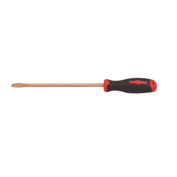 Destornillador de boca plana antichispa, concebido para su uso en entornos potencialmente explosivos, al estar fabricado en aleación de cobre-berilio.