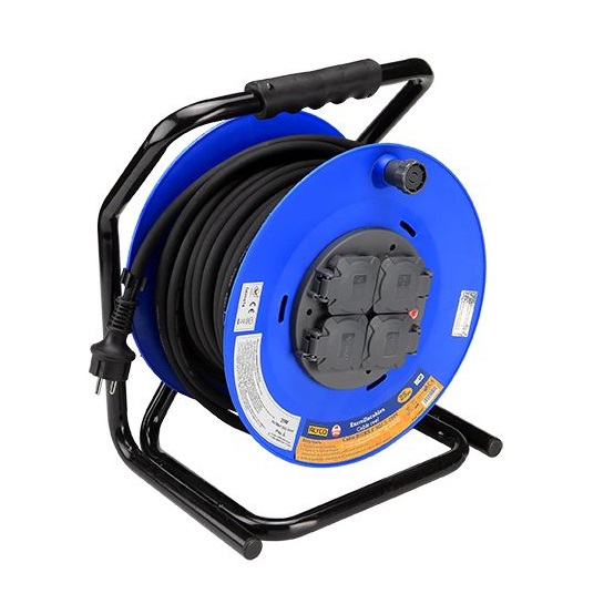 Enrollador de cable eléctrico con cable de 3 x 2,5 mm2, IP44 (protección 4 contra polvo y 4 contra agua), marcas CE y GS. Longitud de cable 25 o 40 metros.
