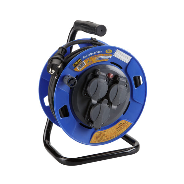 Enrollacables con tapas IP55 3×1,5 mm². 20 mts. Alyco codigo 199403 EAN 8421504994039 n n n nEnrollador de cable eléctrico con cable de 3 x 1,5 mm2, IP55, marcas CE y GS. Longitud de cable 20 o 40 metros.nCable de cobre de 1,5 mm. de grosor que cumple todas las certificaciones de uso y seguridad, dando confianza plena al usuario. Alta capacidad de intensidad eléctrica.nProtecciones de seguridad de todo tipo para evitar cualquier tipo de accidente eléctrico (ver tolerancias de uso)nCorta la corriente en caso de sobrepasar la potencia admisible, dando mas seguridadnRapidez de rebobinado y almacenamiento sin contacto con el suelo.