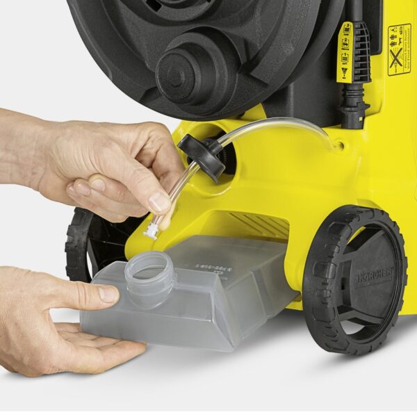 Así es la limpieza a alta presión de hoy en día: El asesor es una útil herramienta que asesora al usuario a través de la aplicación Home & Garden proporcionando prácticos consejos sobre cada situación de limpieza para lograr resultados de limpieza aún mejores con la limpiadora de alta presión K 3 Premium Power Control. Además, la aplicación ofrece un servicio completo que incluye información sobre el equipo, el uso y el portal de servicio Kärcher. Igualmente práctico: la presión se puede ajustar directamente en las lanzas pulverizadoras y comprobarse en el indicador de la pistola G 120 Q Power Control. Se garantiza así la presión idónea para cada superficie. El kit para el hogar adicional garantiza una limpieza sin salpicaduras de superficies grandes en el entorno de la casa e incluye el detergente para superficies T 1 y 500 ml de detergente Patio & Deck. El detergente se aplica de forma rápida y cómoda a través del depósito de detergente integrado. La K 3 Premium Power Control destaca también por su enrollador de mangueras, un asa telescópica extensible que permite extenderla y recogerla cómodamente, un pie de apoyo para mayor estabilidad, sujeciones para los accesorios, la pistola de alta presión y el cable, además del sistema Quick Connect de Kärcher. El pie de apoyo puede ser empleado también como asa de transporte.
