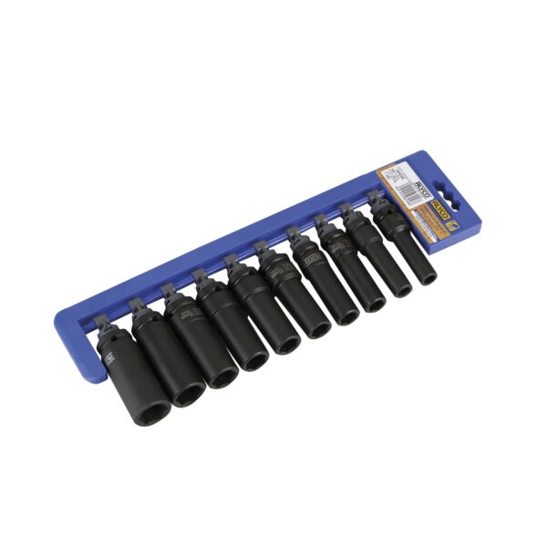 Juego de 10 llaves de vaso de impacto largas con boca hexagonal y cuadradillo de 1/2″. Diferentes medidas: 10, 11, 13, 14, 15, 16, 17, 19, 21 y 22 mm.