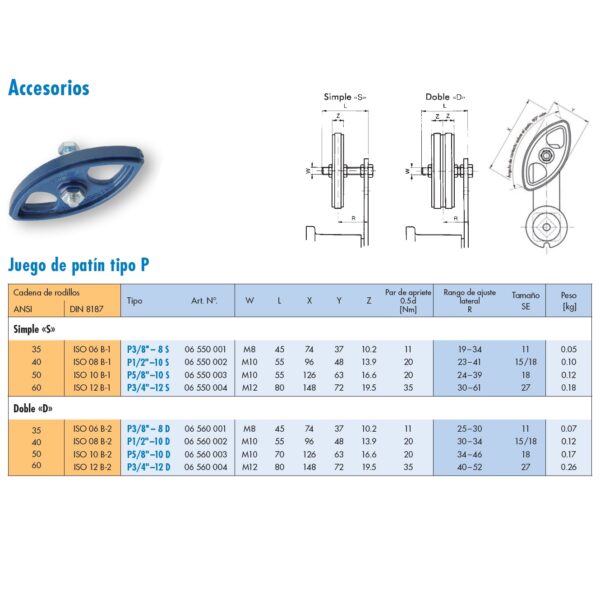 El juego de patín P junto con el tensor, forman una alternativa económica para el tensado de transmisiones por cadena. La alta calidad del patín se consigue con un plástico industrial muy resistente a la fricción, además su diseño nos permite el uso de ambas caras. La máxima velocidad de la cadena no deberá exceder de 1,5 m/seg.
