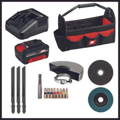 El set de máquinas Einhell TE-TK 18/3 Li Kit (JS+CD+AG) es el equipamiento perfecto para cualquier taller doméstico. En el set están contenidos el taladro con batería TE-CD 18/40 Li, la amoladora angular con batería TC-AG 18/115 Li y la sierra de calar con batería TC-JS 18 Li. Todos los equipos son parte de la familia Power X-Change y pueden operarse flexiblemente con todas las baterías Power X-Change de 18 V. y cargadores. La sierra de calar con batería Einhell es flexible y garantiza cortes rápidos y precisos. Gracias a la libertad sin cables se puede utilizar lejos de la toma de corriente en el hogar, el taller y el garaje. La suavidad de marcha garantiza cortes precisos, la carrera pendular se puede conectar para cortes rápidos. La recepción de hoja de sierra universal permite un cambio sin necesidad de herramientas. La función de aspiración de polvo garantiza una visión óptima. El inserto deslizante integrado de plástico cuida las piezas de trabajo sensibles. El taladro con batería TE-CD 18/40 Li de Einhell es un ayudante manejable para trabajos de atornillado y perforación. El engranaje de 2 marchas para potente perforación y atornillado se regula finamente mediante la electrónica de velocidad de giro. La iluminación Led integrada garantiza un trabajo óptimo en zonas oscuras. El diseño ergonómico y el agarre suave ofrecen la máxima manejabilidad. La amoladora angular con batería TC-AG 18/115 Li de Einhell para lijar, cortar y pulir es la más ligera amoladora angular de su clase. El arranque suave y la protección contra rearranque garantizan la seguridad. La protección contra sobrecargas, la robusta carcasa del engranaje de aluminio y el flujo de aire modificado garantizan una vida útil prolongada. La alta marcha suave por desacoplamiento de motor y engranaje y el diseño esbelto con agarre suave ergonómico permiten un trabajo agradable. La empuñadura auxiliar se puede montar en tres posiciones. Igualmente en el alcance del envío están contenidos una batería Power X-Change de 4,0 Ah, un cargador, tres hojas de sierra para madera, un disco de corte, un plato de lija de lamas, una protección de disco de corte, un juego de puntas y la bolsa 45/22 de Einhell como práctica bolsa de transporte y conservación.