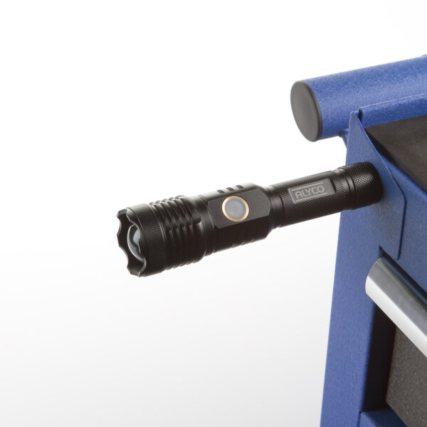 Linterna ligera con carcasa de aluminio y enfoque preciso o amplio según el ajuste del zoom. Posibilidad de uso al 100% o al 50%.