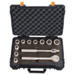 Llave de apriete de doble articulación y 2 llaves de vaso fabricada en acero inoxidable, dura y altamente resistente a la corrosión, para trabajar en las condiciones ambientales más hostiles.