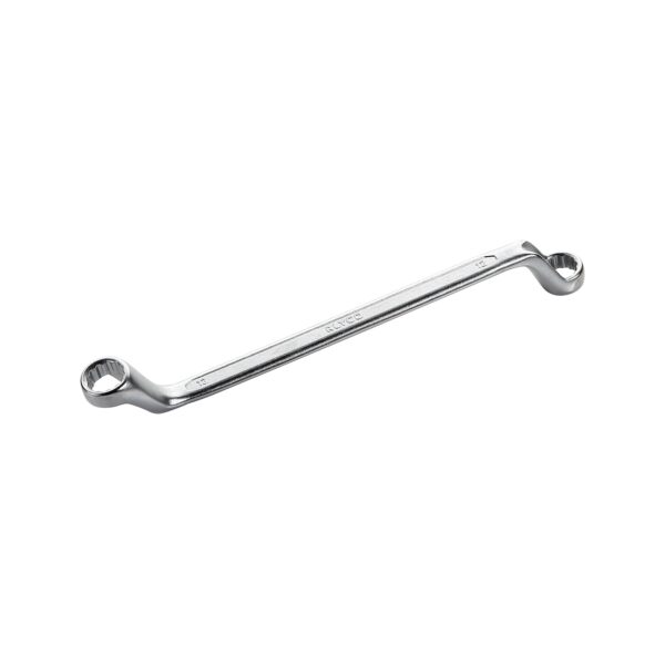 Llave de dos bocas estrella acodada. Las bocas de estrella tienen 12 aristas redondeadas. Fabricada en Acero al Cromo- Vanadio, endurecida por tratamiento térmico, y con tratamiento superficial de cromado para evitar la oxidación.