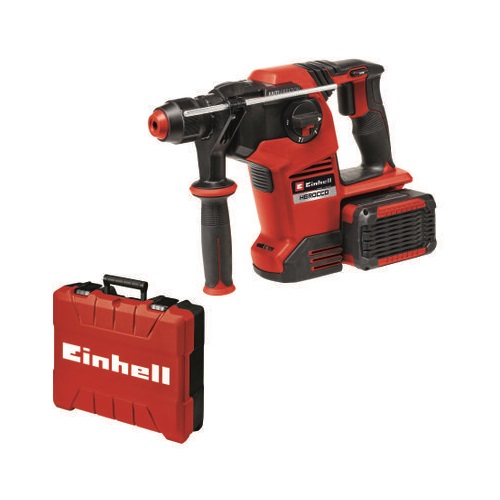 El martillo perforador con batería Einhell Herocco 36/28 es un potente ayudante para la obra, que reúne 3,2 Joule de fuerza y una potencia de perforación elevada con la libertad sin cables de un equipo con batería. Como miembro de la familia Power X-Change de Einhell, todas las baterías de iones de litio de alta calidad de la serie se pueden combinar con el martillo perforador. Con la tecnología TWIN-PACK, el martillo perforador se hace funcionar por dos baterías Power X-Change de 18 voltios, esto significa: Más potencia para materiales desfavorables. El martillo perforador reúne cuatro funciones en una: perforación o perforación con impacto, así como cincelado con y sin fijación. El motor sin escobillas ofrece más potencia y una vida útil más larga que un motor de escobillas de carbono convencional, totalmente sin desgaste mecánico. El mecanismo neumático de percusión del martillo perforador concede un ligero juego para una perforación continua en el hormigón. El martillo perforador está equipado con un portaherramientas SDS-plus con modo semiautomático, una unidad electrónica de velocidad de giro con gran precisión de regulación para trabajos delicados pese a toda la fuerza del martillo perforador y un tope de profundidad de perforación robusto y ajustable de forma continua de metal macizo. La manipulación del martillo perforador con batería se facilita por la empuñadura amortiguadora de vibraciones, que permite un trabajo con bajo nivel de vibraciones. Además, el martillo perforador está equipado con una empuñadura auxiliar fijada de forma segura mediante nervadura con agarre suave, el acoplamiento de resbalamiento por sobrecarga proporciona una elevada seguridad del usuario. Para la mejor visión de la zona de trabajo, el martillo perforador está dotado con una luz LED. Para el funcionamiento son necesarias dos baterías Power X-Change de 18 voltios, para los mejores resultados se recomiendan baterías de 3,0 Ah o mayores. El suministro incluye el maletín de transporte y almacenamiento E-Box, sin batería ni cargador, que se pueden adquirir por separado.