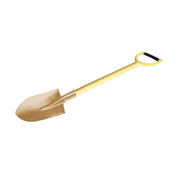 Pala redonda antichispa con mango de anilla, concebida para su uso en entornos potencialmente explosivos, al estar fabricada en aleación de cobre-berilio.