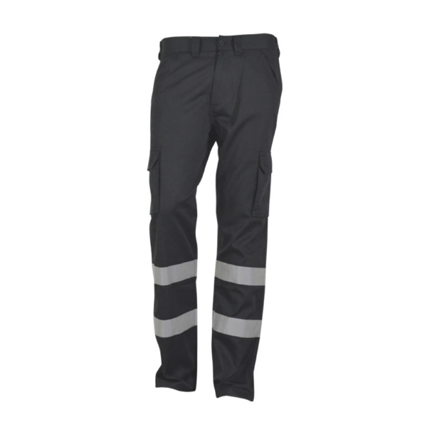 Pantalón largo multibolsillos con dos bandas reflectantes cosidas en el contorno de cada pierna, por debajo de la rodilla. 65% poliéster, 35% algodón, 200 gramos. Tejido sarga, con dos bolsillos frontales, dos bolsillos laterales y un bolsillo trasero con solapa y velcro.