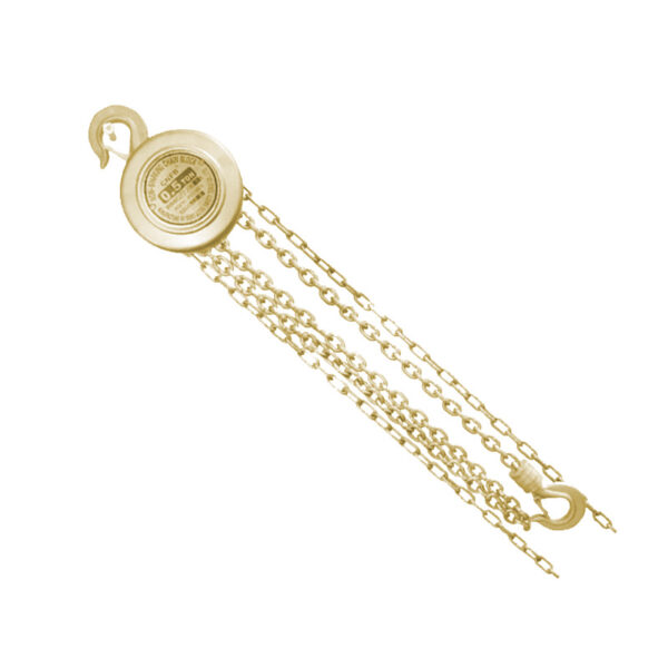 Polipasto de cadena manual antichispa, concebido para su uso en entornos potencialmente explosivos, al estar fabricado en aleación de aluminio-bronce.